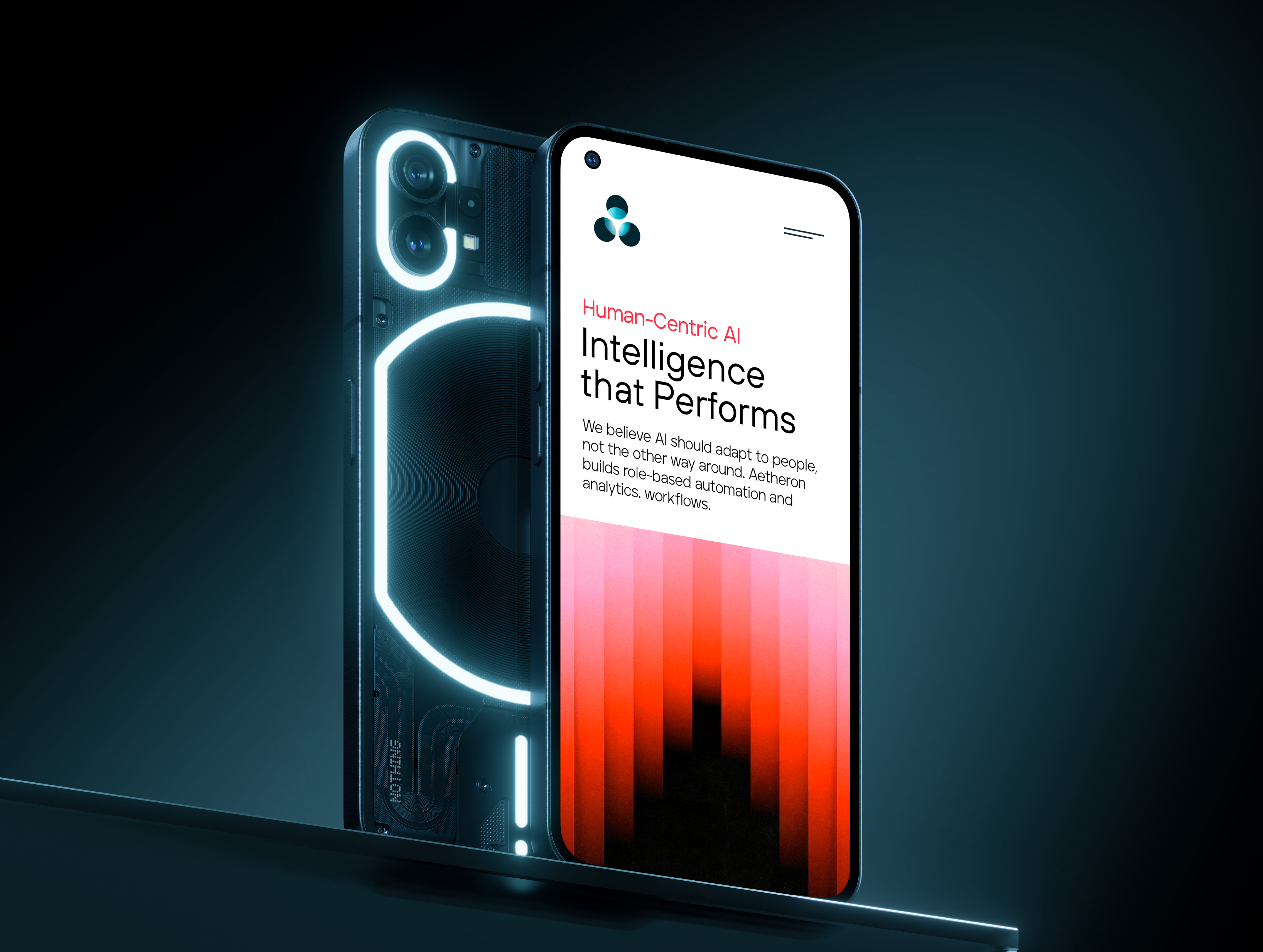 The logo design is rooted in symbolic research: the four circles Torbern Bergman used to identify aether — the element behind the brand's name — adapted and reconstructed to carry two meanings inside a single glyph: the "A" of the brand, and the silhouette of a human figure. Technology that acknowledges people. Scalable at every size, built to be animated, designed to be remembered.